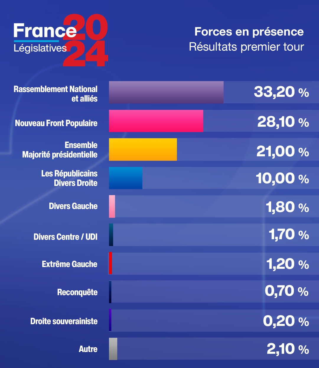Lors du premier tour des élections législatives, le Rassemblement national (RN) a obtenu 33,2 % des voix. Ce parti d’extrême droite, dirigé par Marine Le Pen, a réalisé un score solide et confirme sa position comme l’une des principales forces politiques en France.